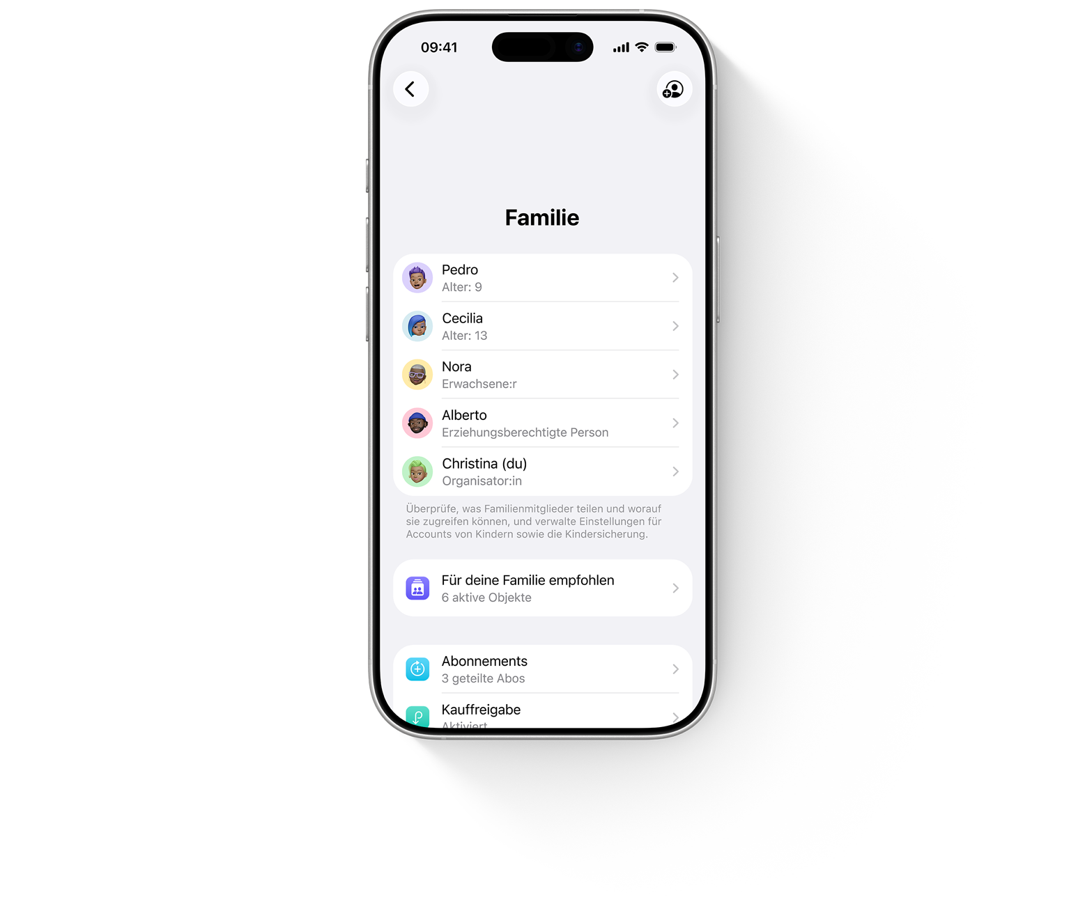 Du kannst Tipps und Vorschläge erhalten, wie du Features für Familien optimal nutzen kannst. Öffne einfach „Einstellungen“, tippe auf deinen Namen, auf „Familie“ und dann auf „Für deine Familie empfohlen“.
