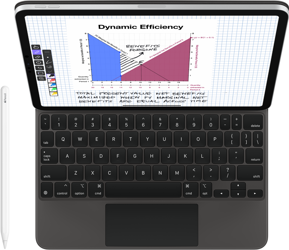 iPad Pro and Apple Pencil. Dr. Gopalakrishnan uses Explain Everything Whiteboard on iPad to record and capture her environmental economics lessons, break down abstract charts and graphs, and show her students how to solve complex mathematical problems in real time.