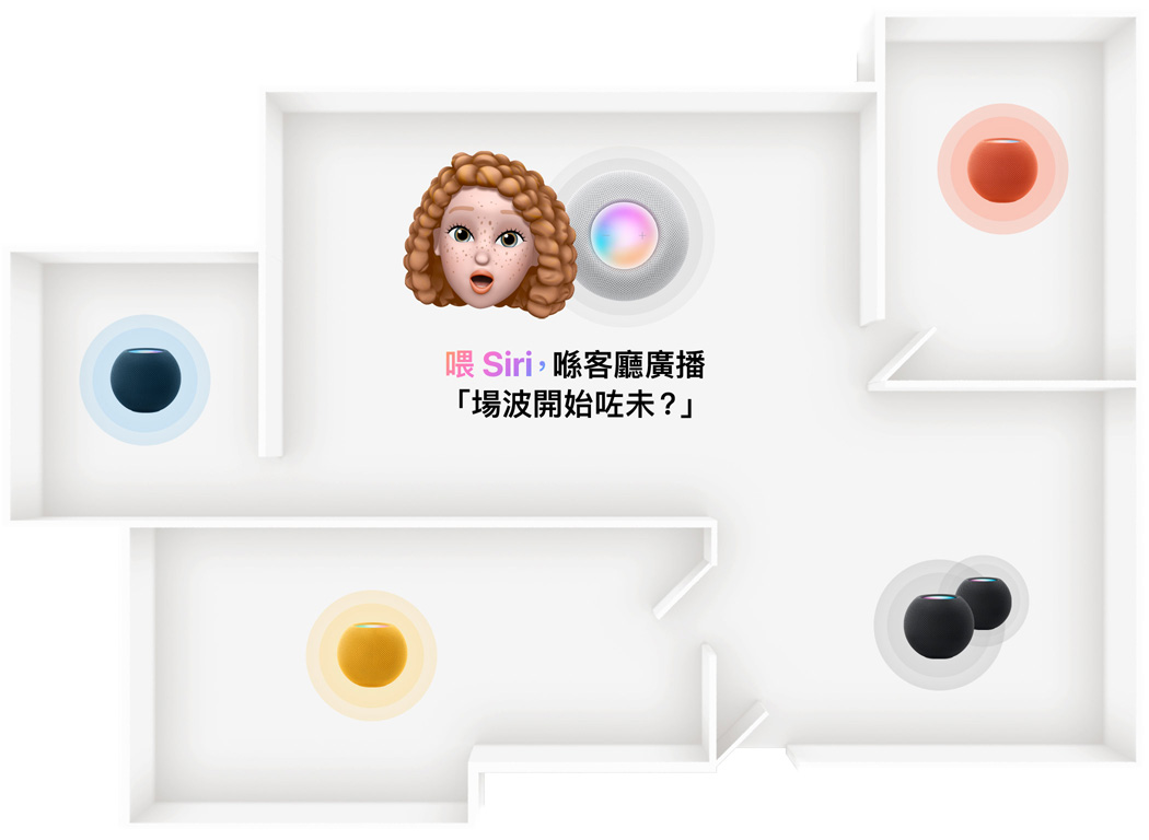 於家中使用多於一部 HomePod mini,即可透過廣播功能,輕鬆與家人聲音互通。叫 Siri 將你的說話傳達至家中每個角落或個別房間,各人亦可輕易回應。