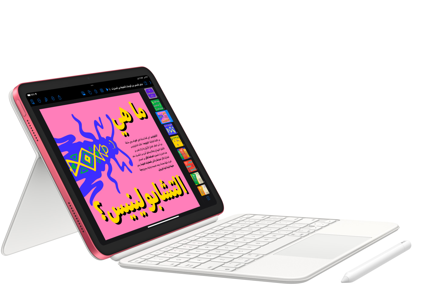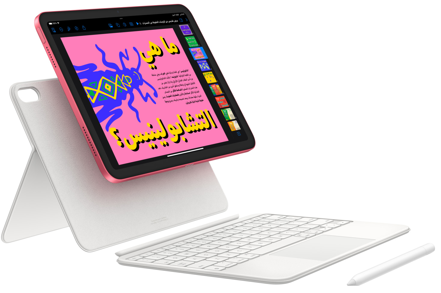 ارسم ولوّن ودوّن بقلم Apple. ومع المحفظة بلوحة مفاتيح ماجيك متعددة الاستعمالات والمصممة من قطعتين، يمكنك الاسترسال في الطباعة واستخدام لوحة التعقب والاستمتاع بمشاهدة كل ما تريد على راحتك.2 ويمكنك أيضاً الاستعانة باختصارات لوحة المفاتيح التي تعرفها وتحبها، أو النقر أينما تشاء على لوحة التعقب. إنها تجربة طباعة مذهلة بالطبع.