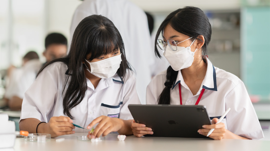 Panyapiwat Enstitüsü Uygulamalı Yönetim Okulu’nda eğitimciler teknolojiyi yaratıcı ve ilgi çekici yollarla kullanıyor Ve bunun için takdir ediliyorlar. Öğretmenlerin her biri Apple Teacher sertifikasına sahip ve ücretsiz Apple Professional Learning programından rozetler kazanıyor. Bu programla eğitimciler iPad ve Mac için temel beceriler edinirken, öğretim ve öğrenim için özel olarak tasarlanan Apple uygulamalarını kullanmayı da öğreniyorlar. Bunlardan biri de Okul uygulaması. Öğretmenler bu uygulamada öğrencilerle bire bir ve gerçek zamanlı şekilde kolayca çalışabiliyor. Böylece herkesin kendini gösterebildiği, duyurabildiği ve başkalarıyla bağ kurabildiği bir ortam oluşuyor.
